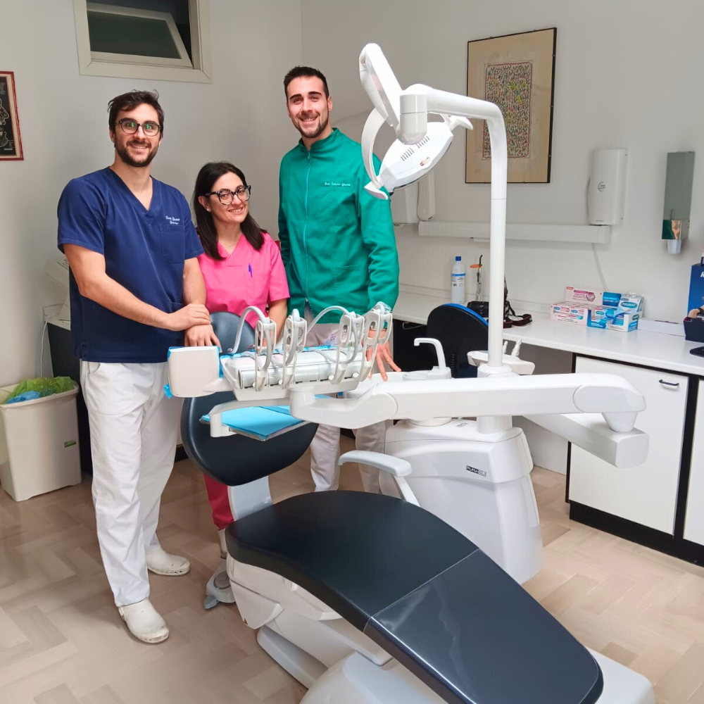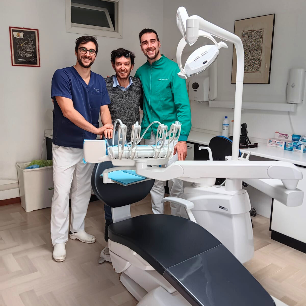 Nelle foto, con il nuovo riunito installato, i dottori con la Aso Ambra e con Matteo Orlandi, agente della Donati forniture dentali.